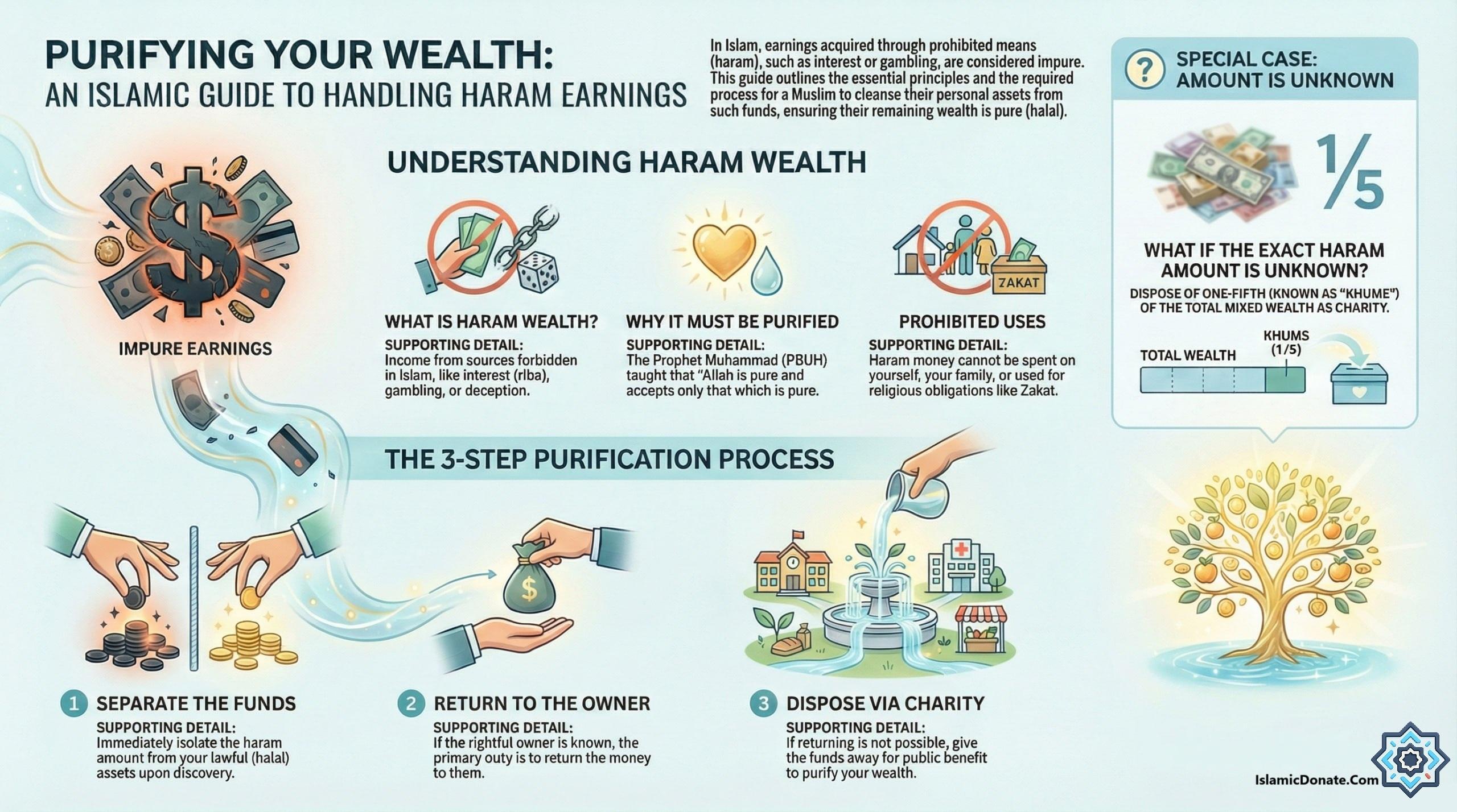 عند مواجهة مال حرام، يكون الهدف الأساسي هو تطهير النفس من دنسه. ويشمل مسار العمل الموصى به ما يلي: