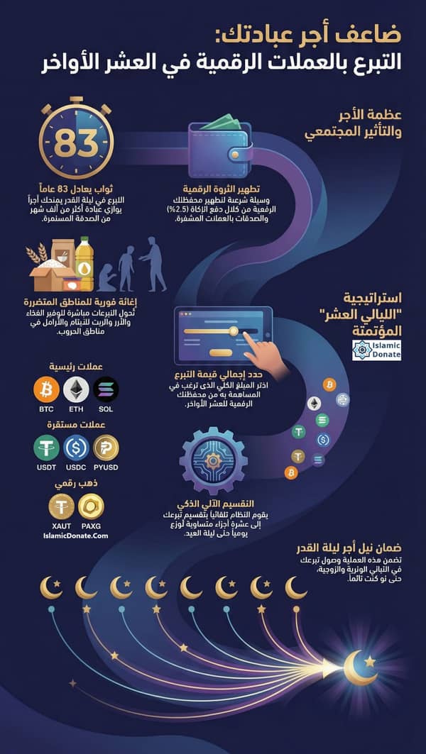 يمكنك ضمان ذلك عبر استراتيجية ليالي العشر التي نوفرها، حيث نقوم بتقسيم تبرعك الإجمالي بالعملات الرقمية إلى عشرة أجزاء متساوية يتم توزيعها تلقائيا على الليالي الأخيرة من رمضان. تضمن هذه الطريقة الذكية وصول صدقتك في كل ليلة، مما يجعلك تدرك أجر ليلة القدر والمضاعفة التي تعادل ثلاثا وثمانين سنة من العبادة.
