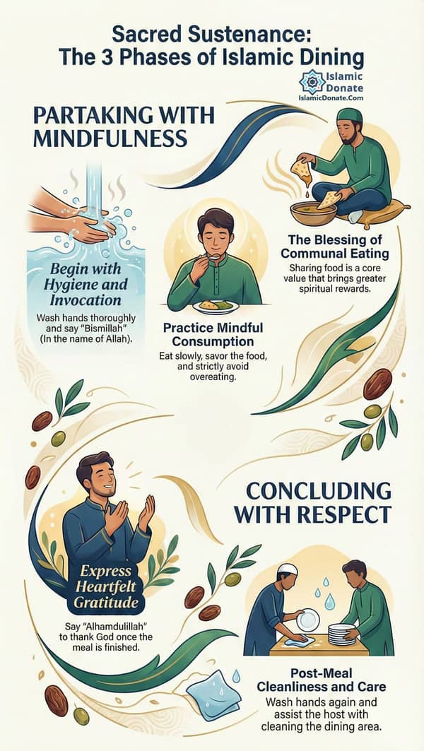 Islam provides a structured approach to meals that emphasizes hygiene and mindfulness.